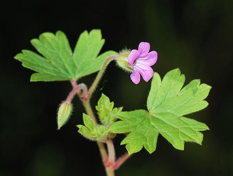 A este tipo de geranio se le conoce también como aguja de Salamanca o geranio silvestre. Al igual que el anterior, es capaz de alcanzar el metro de altura, presentando hojas de un color verde intenso durante todo el año. La Geranium pusillum L. época de floración se da durante los meses de abril a finales de verano. Las flores son pequeñas y de color morado.