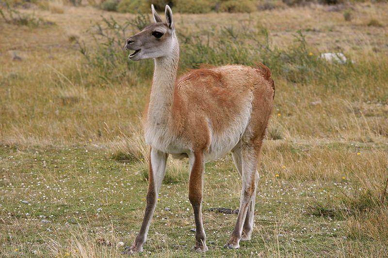 El guanaco es otro de los animales nativos de Chile y se trata de otro tipo de camélido emparentado con la llama y la alpaca. siendo de tamaño algo mayor (puede pesar hasta 150 kg). Tiene un pelaje grueso y ligero, de una llamativa tonalidad rojiza en las zonas dorsales y blanco en las ventrales. Se organiza en grupos familiares denominados "harenes", compuestos por un macho y varias hembras fértiles, o bien en grupos de machos de diversas edades. Al igual que las llamas, escupen ante las amenazas, y su depredador principal es el puma. Se distribuye desde Tarapacá hasta Antofagasta.
