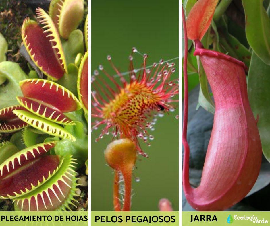 Ahora, te mostramos algunos ejemplos de tipos de plantas carnívoras y en los próximos apartados veremos especies dentro de estos tipos y sus características con fotos.