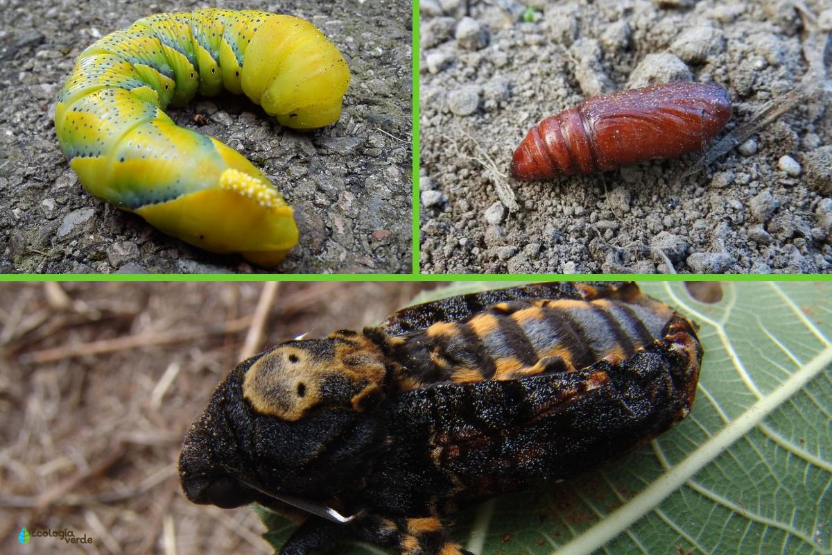 - Primera fase: la larva muestra un color verde claro con franjas diagonales amarillas. El color se oscurece a medida que se va desarrollando.