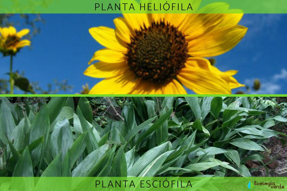La cantidad de luz disponible es otro factor vital para las plantas, ya que sin ella no pueden realizar la fotosíntesis y elaborar sus nutrientes necesarios. Las plantas heliófilas son aquellas que necesitan un gran aporte lumínico para desarrollarse, mientras que las plantas esciófilas prosperan en condiciones de sombra o semisombra. Las primeras reducen su número de estomas para perder menos agua al recibir mayor radiación solar, mientras que las esciófilas lo aumentan al no tener problemas de exceso de transpiración.