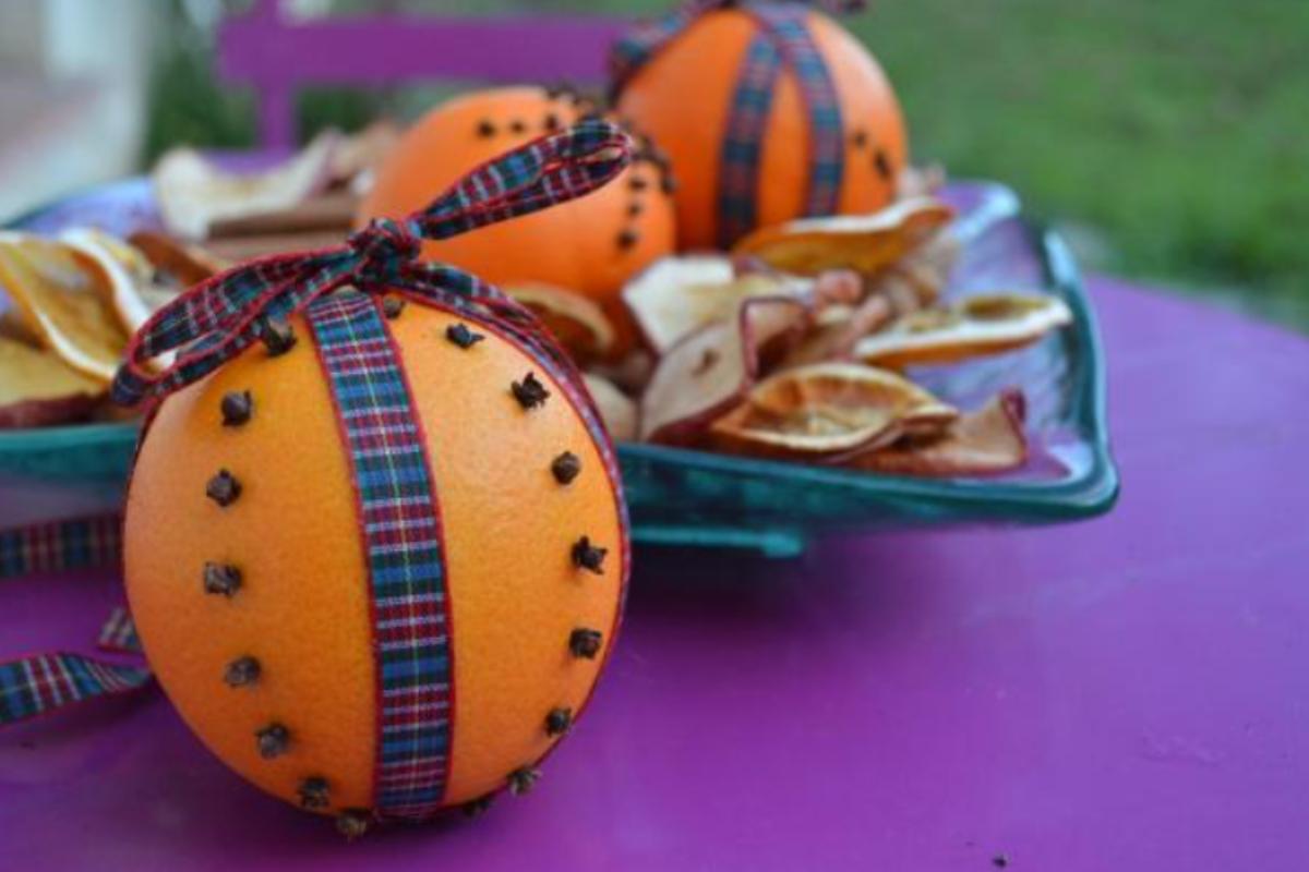 Otra idea muy interesante es de las naranjas con clavos. Podemos colgar naranjas y pincharlas con esta peculiar especia. Verás cómo tu casa huele a Navidad al tiempo que la estás adornando con vivos colores.
