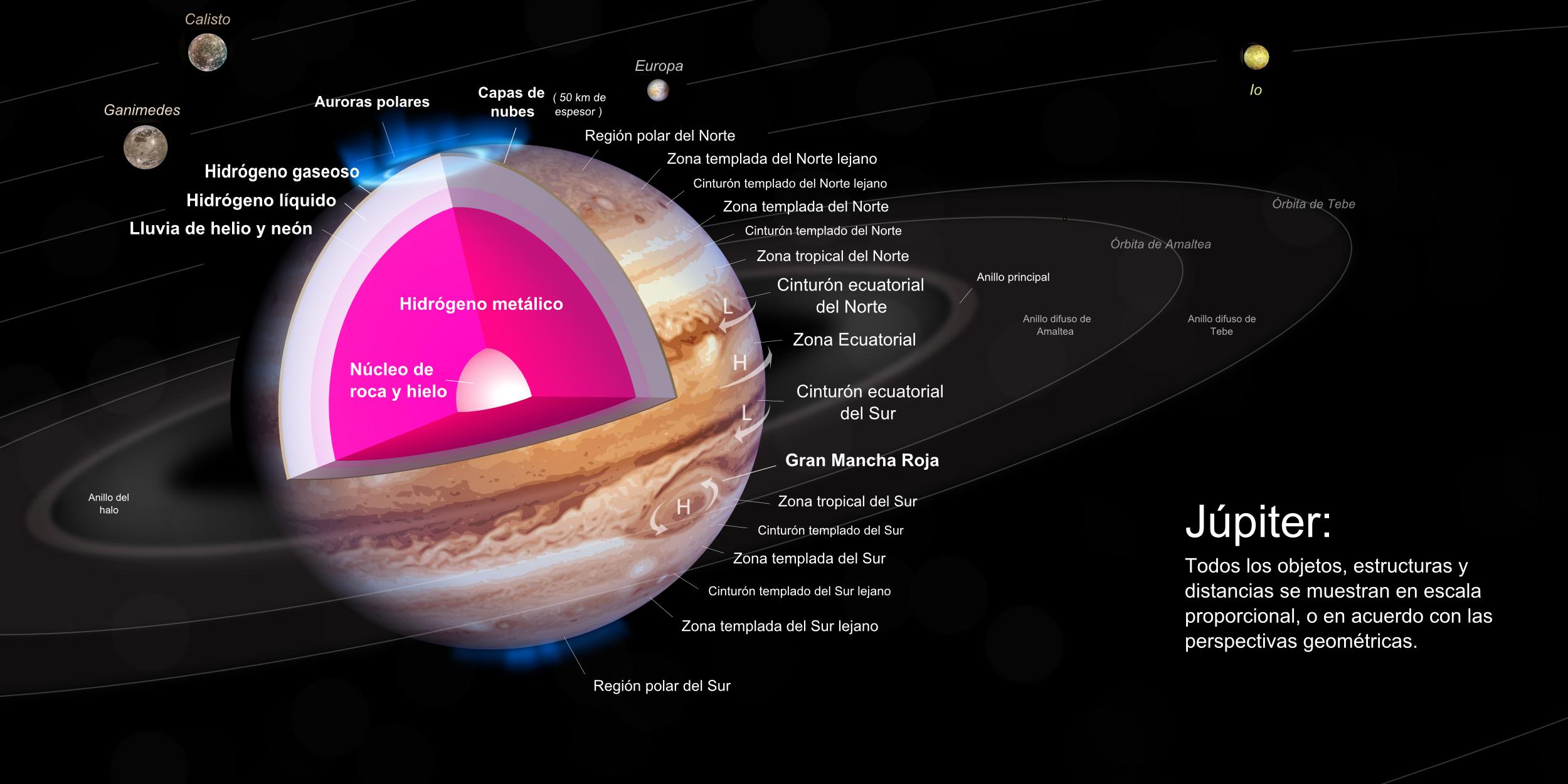 - Anillos tenues pero presentes: como aprendimos a lo largo del artículo, si bien no son tan llamativos como los de Saturno, Júpiter tiene anillos fascinantes. Están compuestos principalmente por partículas de polvo y materiales y son mucho más tenues que los de Saturno. Los anillos de Júpiter son un recordatorio de la diversidad y la complejidad del sistema de anillos planetarios en nuestro sistema solar.