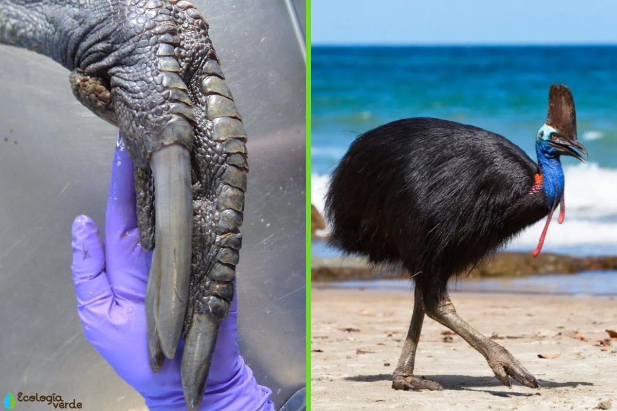 Estas aves australianas son muy particulares porque recuerdan a los dinosaurios. Miden hasta 2 metros de altura y su rostro es de color azul encendido. Tienen unas garras extremadamente largas, de hasta 10 centímetros. Las utiliza para correr a gran velocidad, hasta 50 kilómetros por hora, lo que le ayuda en gran medida pues no pueden volar. También le ayudan para defenderse y con una fácil patada puede deshacerse de la amenaza. Por último, también las usa para alimentarse porque puede perforar fácilmente a insectos, hongos y hasta caracoles.