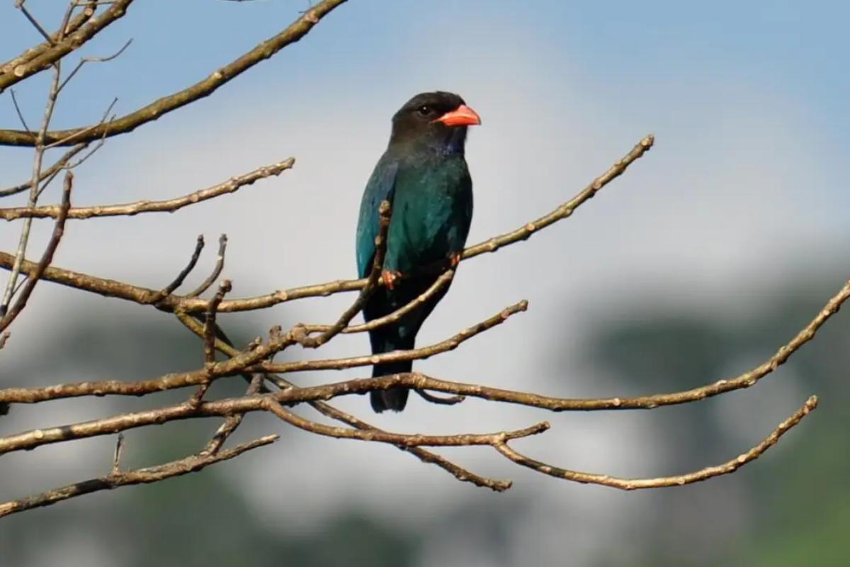 La carraca oriental es una hermosa ave de tonos azules y verdosos, que tiene la característica de tener un círculo blanco o azul claro debajo de cada ala. Tiene el pico y las patas color naranja. Puede medir hasta treinta centímetros de largo. Los jóvenes muestran el pico más oscuro, que se va aclarando conforme van madurando. Come insectos y su preferido es el escarabajo.