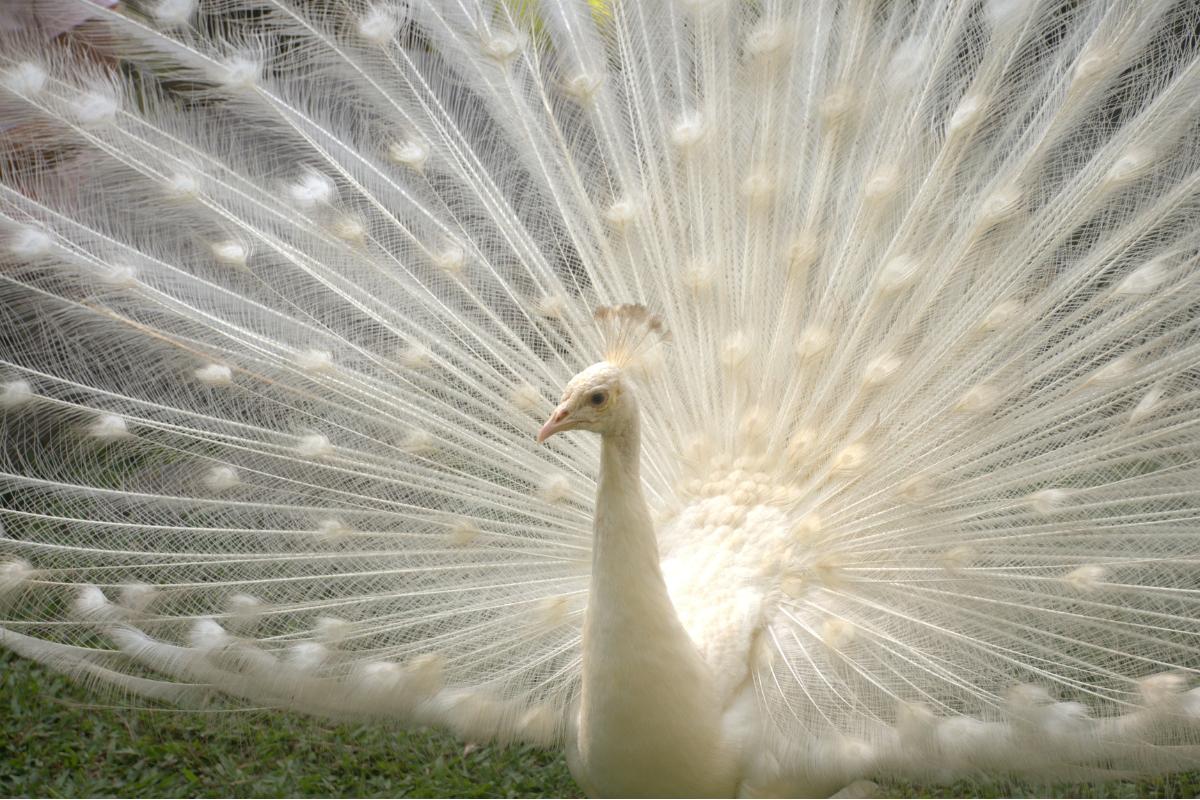 Su condición sin color resulta de una mutación que les aporta leucismo total, impidiendo que el color se adhiera a sus plumas. El nombre científico del pavo real es Pavo cristatus. Es originario de India pero vive en cautiverio en casi todo el mundo cuando hay buen clima. Los machos tienen una cola y unos colores impresionantes para impresionar a las hembras, mientras que las hembras no los tienen.