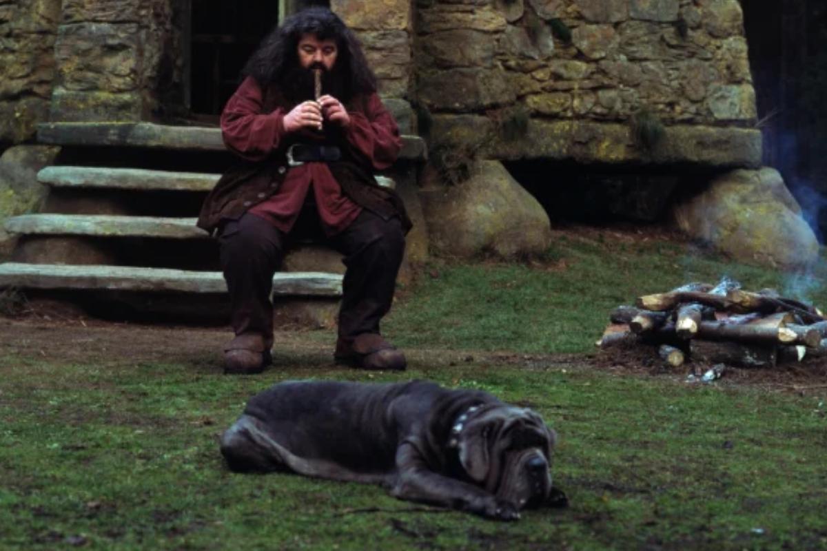 Fang es el perro de Hagrid y es un perro de la raza mastín de Nápoles o mastín napolitano. Este perro es grande y fuerte, pero también es cobarde o asustadizo. Siempre acompaña fielmente a Hagrid, pero si ve peligro se esconde. De hecho, cuando va al Bosque Prohibido con Hagrid, Harry y los demás, Fang huye al asustarse. El mastín napolitano es un perro de talla grande, de tipo molosoide y que, como su nombre indica, proviene de Italia.