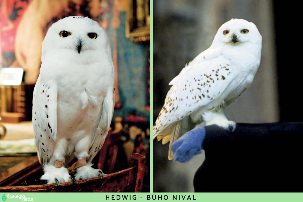 Hedwig fue un regalo de Hagrid a Harry, por su onceavo cumpleaños, y desde entonces fueron compañeros inseparables hasta su muerte. Este es uno de los animales reales en Harry Potter que aparecen en los libros y la película. En las películas se usó a un búho nival o Bubo scandiacus. Esta especie vive cerca de la nieve y en la tundra, en el círculo polar Ártico, en Asia, América y Europa. Es de color blanco para camuflarse con el entorno. Cuando el frío es muy intenso viaja a zonas algo más cálidas. Es diurno y se mantiene despierto desde que sale el sol hasta que se oculta. Caza especies pequeñas y peces.