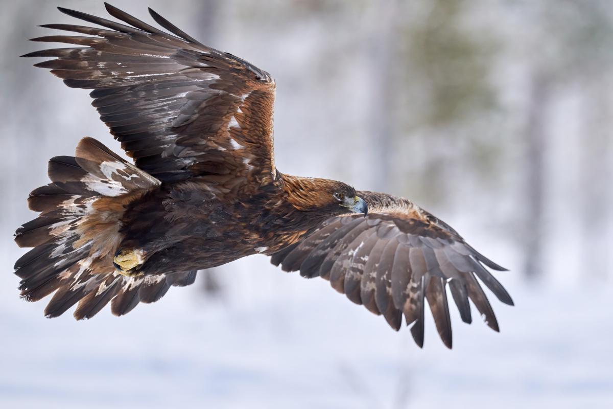 El águila real habita regiones montañosas y boscosas donde los inviernos pueden ser muy severos. Es un ave de presa fuerte y resistente, capaz de cazar incluso bajo la nieve. Gracias a su excelente visión, puede detectar presas a más de un kilómetro de distancia. Durante la estación fría, caza pequeños mamíferos y aves, demostrando una gran capacidad de adaptación al entorno.