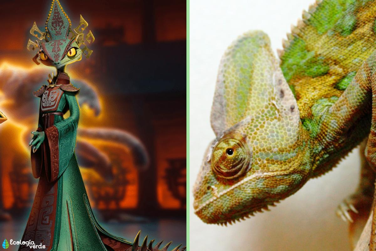 La Camaleona es una malvada hechicera cambia formas. No solo puede transformarse en quien quiera, sino que también puede robar el kung fu de otros con su magia y usarlo. Se trata de una especie de camaleón de Asia, conocido como camaleón calyptratus (Chamaeleo calyptratus).