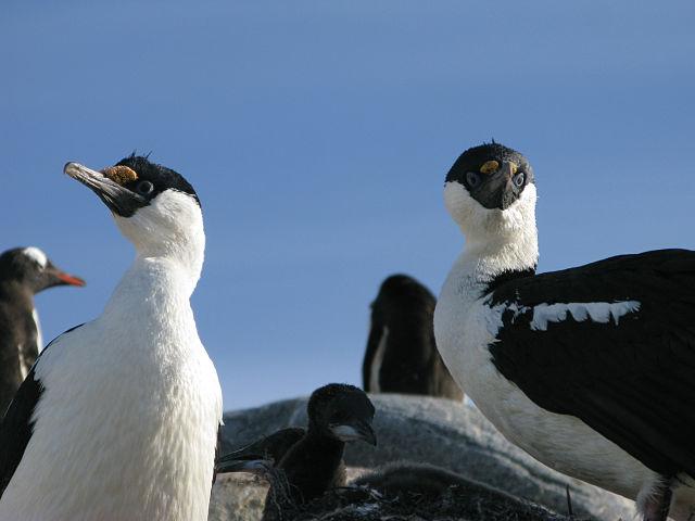El cormorán antártico (Leucocarbo bransfieldensis), como su nombre indica, es uno de los animales de la Antártida que se considera exclusivo de la zona o endémico. Su peculiaridad más relevante son sus ojos azules, los cuales le dan su nombre como el cormorán de ojos azules. Tiene un tamaño de entre 70 y 80 centímetros y un peso de hasta 3.5 quilos. Como dato curioso de esta especie, es que tiene unas plumas que no son totalmente impermeables, de manera que cuando se mojan provocan un aumento de peso al animal que les facilita la inmersión.