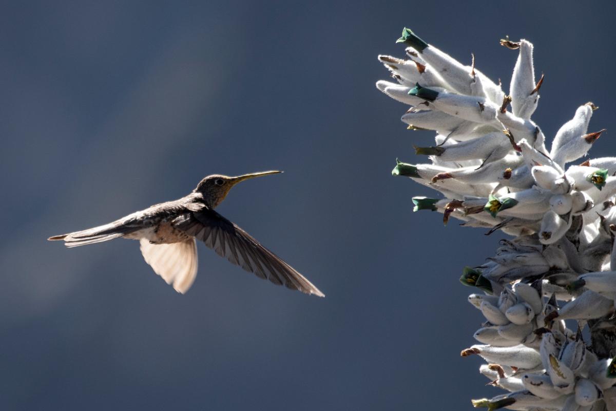 Habita en las altas cordilleras andinas, donde haya agua cerca y a altitudes considerables de hasta 4.200 metros de altura. Como su nombre indica, es el colibrí más grande que existe con 23 centímetros de largo, equivaliendo al tamaño de un ave promedio. Es muy grande para un colibrí, pero esto le sirve para poder tolerar las condiciones de grandes alturas, como es la baja temperatura y falta de oxígeno, en donde los colibríes pequeños no podrían sobrevivir.