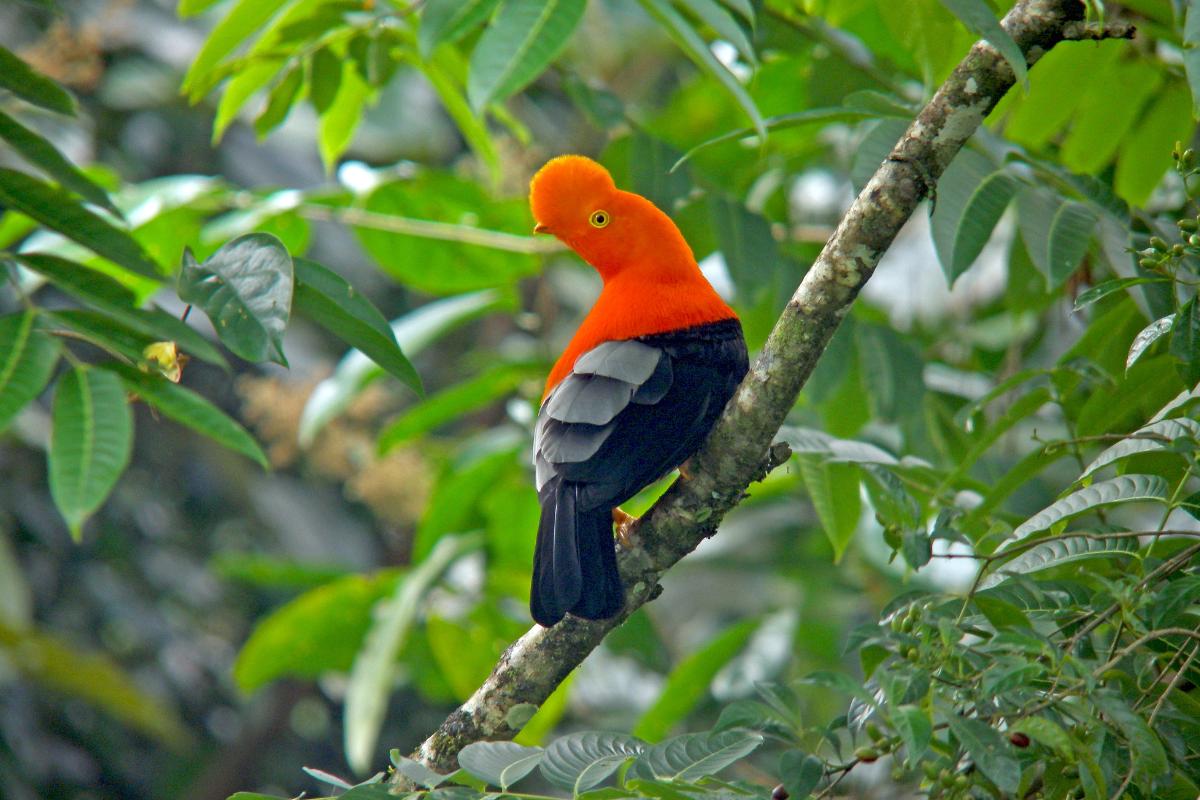 Es una espectacular ave que llama la atención por el macho con cabeza y cuello de encendido color rojo y cuerpo negro, mientras que la hembra es de color más pardo. Tienen ojos azules y una cresta sobre la frente de abundantes plumas. Habita en los bosques nublados del Perú, en las selvas de montaña donde llueve constantemente.