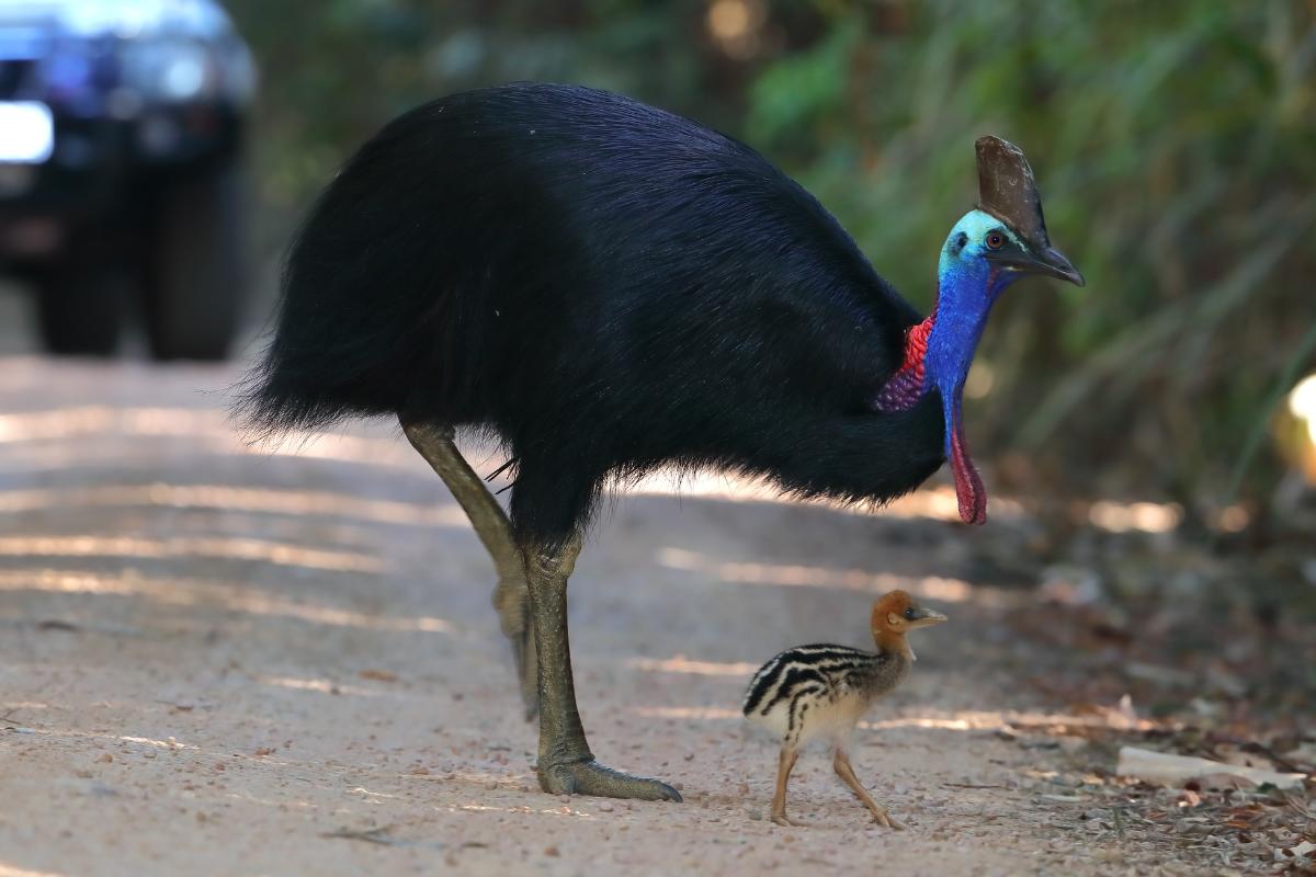 Este casuario, nativo de los bosques tropicales del norte de Australia y Nueva Guinea, es una de las aves más imponentes del planeta. A pesar de no parecerse al avestruz en color (su plumaje es negro y su cuello azul intenso con carúnculas rojas), comparte varios rasgos clave: no vuela, tiene una gran altura (hasta 1,8 metros) y patas muy musculosas.