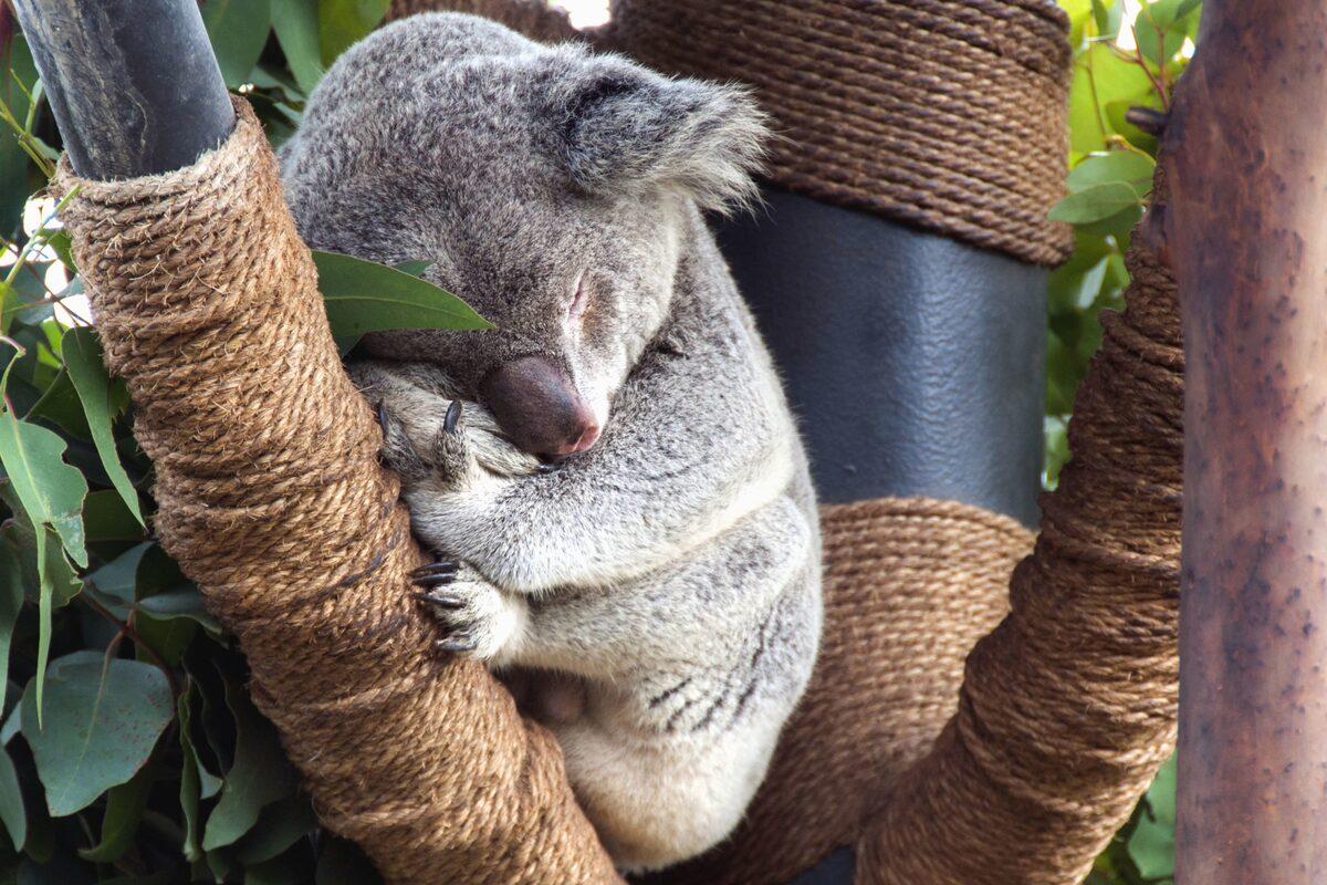 El koala (Phascolarctos cinereus) es una especie de mamífero marsupial endémico de Australia y habita en bosques de eucaliptos, ya que sus hojas conforman la mayor parte de su dieta. Como su alimento les brinda poca energía, los koalas deben reducir al mínimo su actividad diaria y, por lo tanto, realizan movimientos activos durante apenas 4 horas al día. ¿Sabías que es uno de los animales que más duerme? Llega a completar más de 20 horas de sueño descansando sobre los árboles.