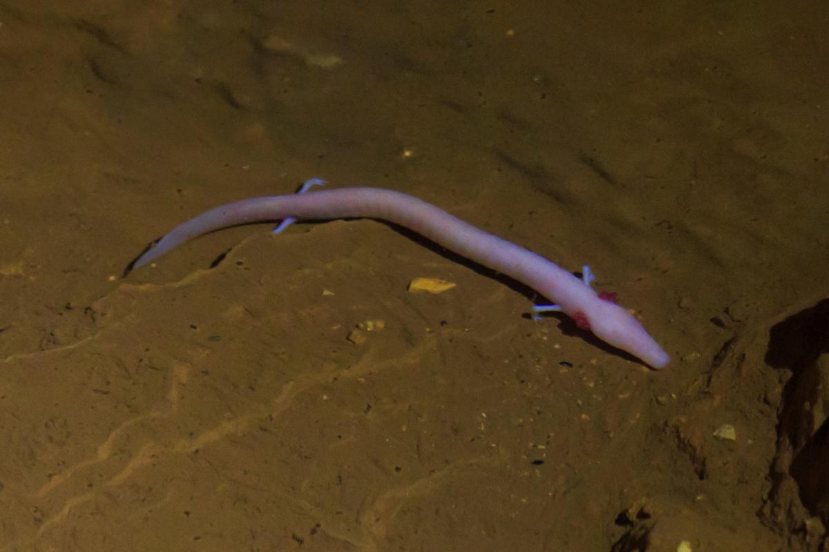 Es muy similar a los ajolotes, pero es en realidad una salamandra. Sus ojos no son funcionales, están cubiertos por piel y no pueden distinguirse. Habita en cuevas y tiene branquias externas para captar oxígeno. Su piel se ha desarrollado para detectar pequeñísimos cambios en su entorno. Su cabeza también es muy grande y aplanada para mejorar sus órganos sensoriales. Puede pasar largo tiempo sin comer.