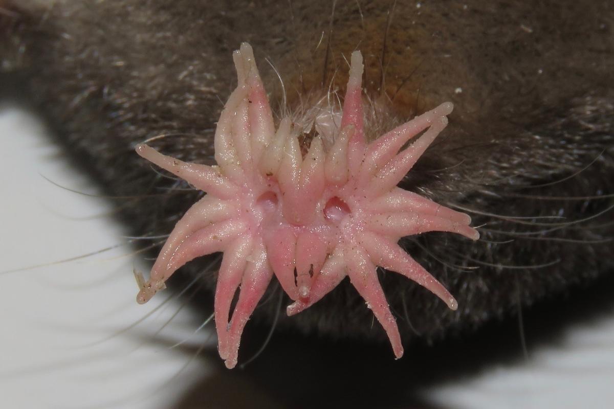 Estos topos subterráneos no necesitan ver porque tienen una nariz muy avanzada, llena de tentáculos con los que puede reconstruir mentalmente su entorno con la información que esta le proporciona. No solamente puede captar olores, sino también vibraciones de su entorno y los campos eléctricos de otros animales. Sus ojos están muy reducidos. Esto también funciona para protegerse del polvo que hay bajo tierra.