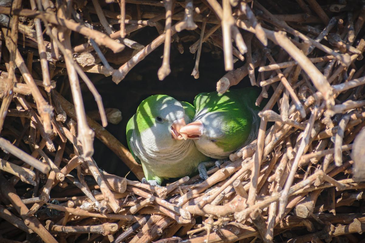 Algunas especies de cotorras como la cotorra Argentina (Myiopsitta monachus) constituyen grupos sociales de gran complejidad llegando a construir nidos comunales en la mayor altura posible disponible, generalmente en árboles como aquellos del género Eucalyptus. A diferencia de muchas otras especies de psitácidos, las cotorras construyen sus propios nidos con ramas. Un solo nido puede albergar a decenas de parejas reproductoras. La cooperación no se limita a la construcción: las cotorras también se alertan entre sí ante la presencia de depredadores, se acicalan y mantienen fuertes vínculos sociales.