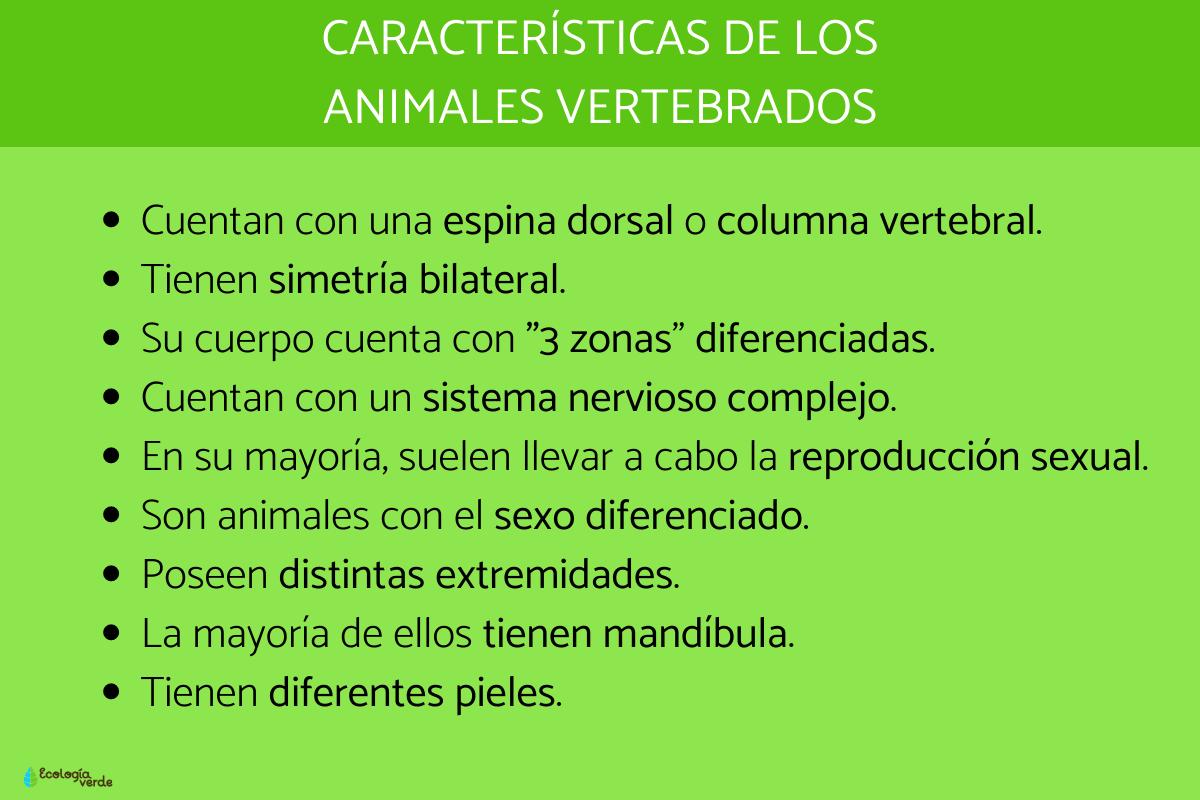 - Cuentan con una espina dorsal o columna vertebral: les proporciona determinada rigidez y robustez al esqueleto del animal, la cual está constituida por vértebras. Desempeña la importante función de sostén y a la vez, protección de la médula espinal y los nervios del sistema nervioso, así como de adaptación al desplazamiento del animal, ya sea en ambientes terrestres, acuáticos o aéreos.