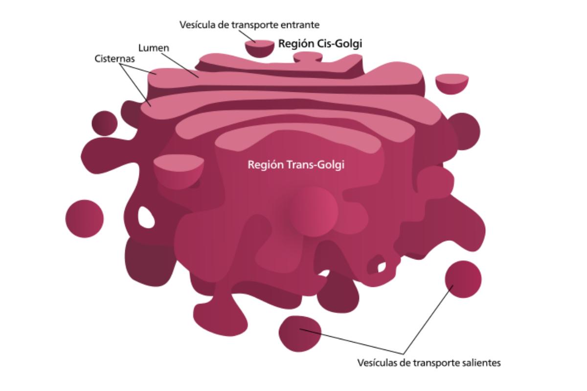 - Cara-cis y cara-trans: dicho lumen tiene dos caras. La cis es el lado receptor de vesículas, y la trans es la cara que las envía hacia fuera. En medio de ambos polos están las cisternas intermedias. Dado el nombre de estas caras, el movimiento de las vesículas tiene una dirección de cis a trans. La cara cis suele quedar más cerca del retículo endoplasmático. Cada cara tiene polaridad, grosor y composición molecular diferente.