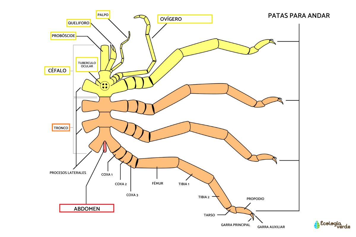 - Se dividen en cabeza, patas, y abdomen con tórax fusionados: en la mayoría de los artrópodos se ven claramente las divisiones de los tagmas o fragmentos corporales, pero los picnogónidos los tienen muy fusionados. Su cuerpo es muy reducido.