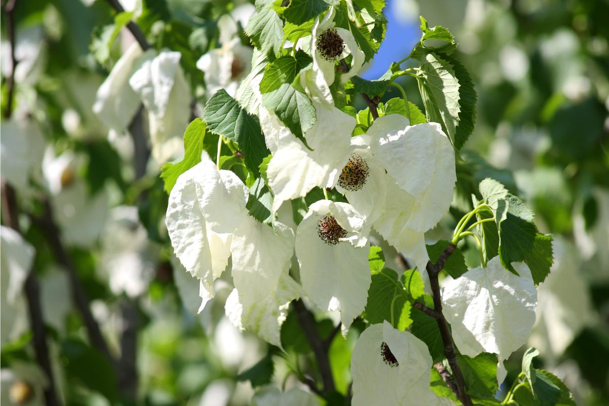 El árbol de los pañuelos es grande, puede crecer hasta 25 metros de alto. Es famoso por su flor blanca que parece dibujada, pues tiene una forma muy curiosa: pequeño redondeado hacia arriba y largo hacia abajo, lo que da la idea perfecta de un pañuelo que está tomado del centro por una mano. Es una flor única que cae hacia abajo de forma ligera al viento, y van varias en cada rama, lo que produce la imagen de un techo decorado a mano con adornos especiales.