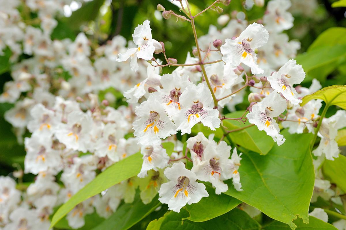 La catalpa es un árbol que se usa en jardines grandes porque brinda buena sombra. Mide hasta 10 metros de alto y sus hojas son grandes y anchas. En el invierno pierde sus hojas y el tronco se queda con vainas suspendidas, de las que brotarán en la primavera, o en mayo y junio según la zona, bellos racimos de flores blancas que tienen forma de campana o trompeta pequeñas, el centro amarillo y múltiples puntos morados.