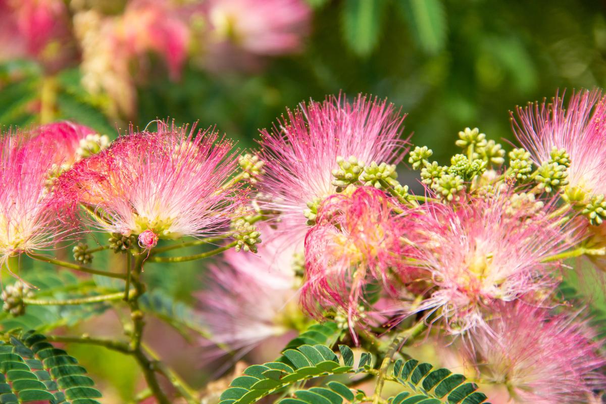 También conocido como árbol de la seda o acacia de flores sedosas, esta falsa acacia llega a medir 15 metros de alto, presumiendo una copa ancha, con flores y hojas que están cubiertas de pequeños y delgados “pelos”. Las flores que presenta están hechas de delgadísimos y largos filamentos color rosa. Es un árbol que soporta incluso la sequía, y que nos asombra cuando en la noche pliega sus hojas para dormir. Si te gustaría tener este árbol con flores rosas, aquí puedes ver el precio de sus semillas.