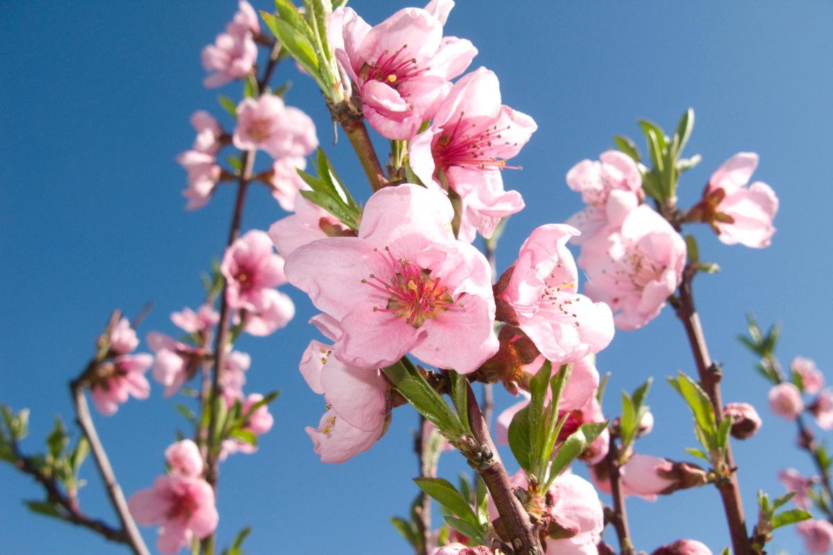 El durazno o melocotonero tarda algún tiempo para florecer, tanto como tres o cuatro años. Requiere de un suelo seco y soleado, pero también de muchas horas de frío en invierno para que sus flores puedan darse de manera diferenciada, es decir, que haya masculinas y femeninas. A la par de su suculento fruto, la flor del durazno proporciona igual o mayor atractivo visual. Es una flor pequeña, en diversos tonos rosas que van del más pálido al más fuerte. Son solitarias, geminadas o divididas, y con numerosas brácteas, que son una especie de pétalos verdes que unen a la flor con la rama, ya que no tiene tallo. La flor aparece en cada nudo de las ramas.