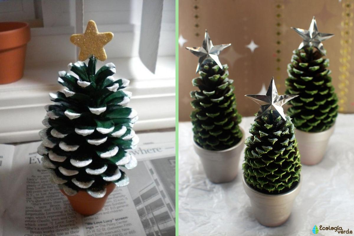 Si lo que deseas es hacer un pequeño arbolito para poner en cualquier rincón de tu estantería, el árbol de Navidad con piñas es la mejor opción. Ve al bosque y coge piñas secas que hayan caído de los árboles. Luego las pintas con un spray y las colocas dentro de una maceta pequeña. Para finalizar, coloca una estrella pequeña. Este arbolito te puede servir si quieres hacer algún detalle de Navidad original y bonito.