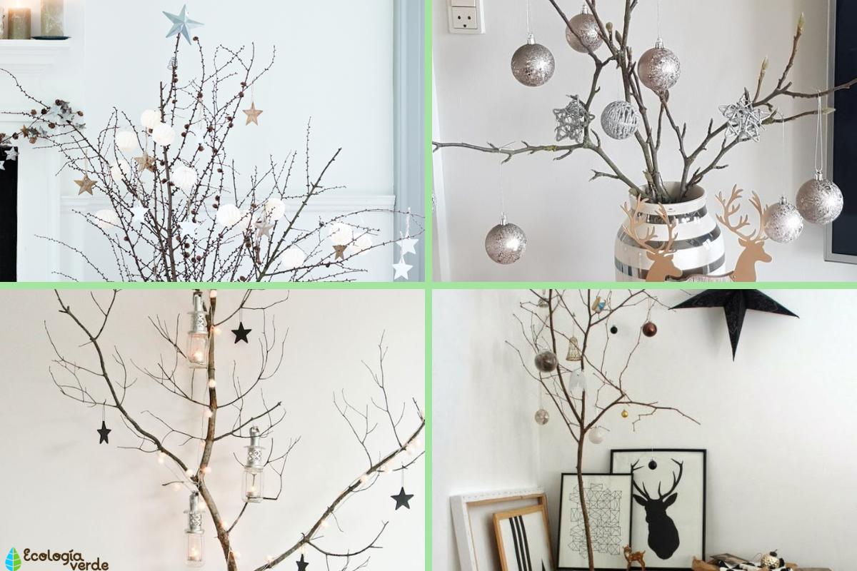 Esta opción de árboles de Navidad reciclados es muy sencilla de hacer. Solamente hay que coger algunas ramas secas largas y ponerlas en un jarrón. Puedes cogerlas del grosor que quieras. Una vez hecho, cuelga adornos de Navidad y luces. Este árbol de Navidad hecho a mano marca tendencia y es muy elegante.