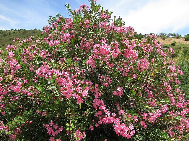 Más conocido como adelfa, este arbusto de hasta 5 metros de altura es muy común en jardines de pequeño tamaño de la zona mediterránea, donde es apreciado por sus vistosas flores rosas, que aparecen en la primavera y duran bastante tiempo. Es muy poco exigente con sus cuidados y puede cultivarse sin problemas en maceta.
