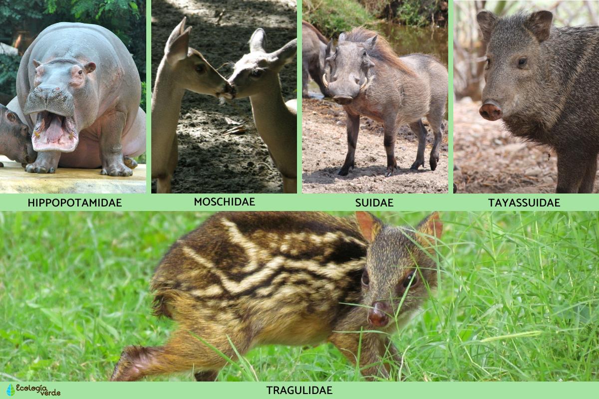 - Suidae: incluye los cerdos, jabalíes, babirusas y el facóquero. Son animales omnívoros y rumiantes que se encuentran en bosques o estepas. Tienen una mala visión pero un excelente olfato.