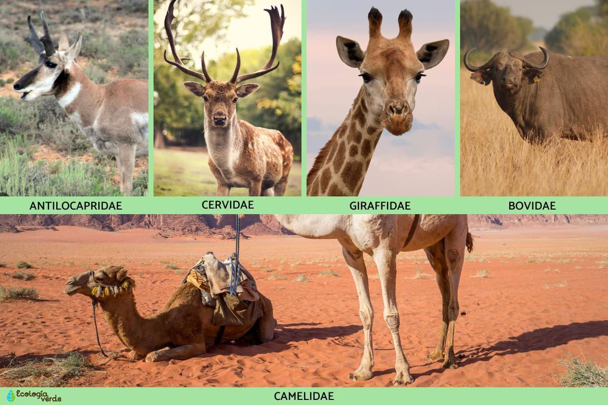 - Antilocapridae: incluye una única especie y es endémica de América del Norte. Es un animal similar al antílope, rumiante y con cuernos en ambos sexos.