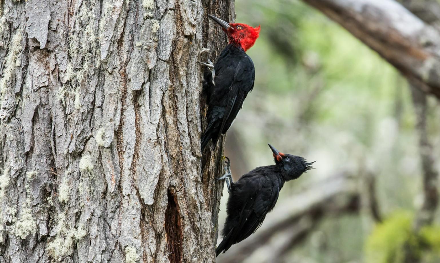 El carpintero gigante, (Campephilus magellanicus) es un ave endémica de los bosques andino-patagónicos y común de observar en los Parques Nacionales Nahuel Huapi y Lanín. El macho posee la cabeza y el copete de color rojo y la hembra la cabeza y el copete de color negro. Es una especie capaz de trepar a la parte superior de los árboles picoteando fuertemente la corteza a partir de la cual obtiene los insectos que conforman la base de su dieta.