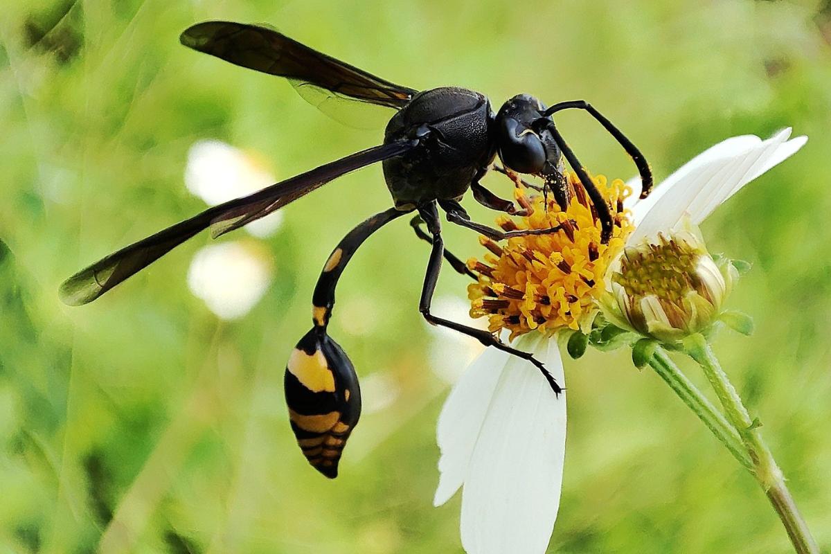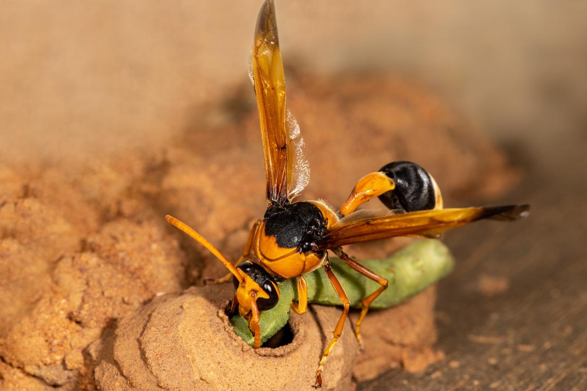 La avispa alfarera es polinizadora y se alimenta de néctar floral, siendo este servicio medioambiental uno de los beneficios de la avispa alfarera para el ecosistema.