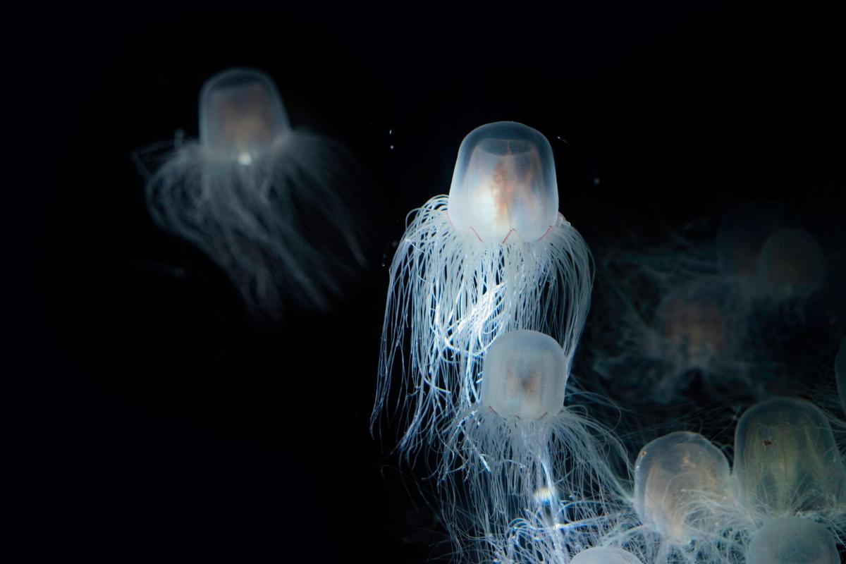 - Tienen 24 ojos rudimentarios, una característica también atípica entre la mayoría de las medusas. Funcionan como fotoreceptores para detectar cambios de luz en su entorno.