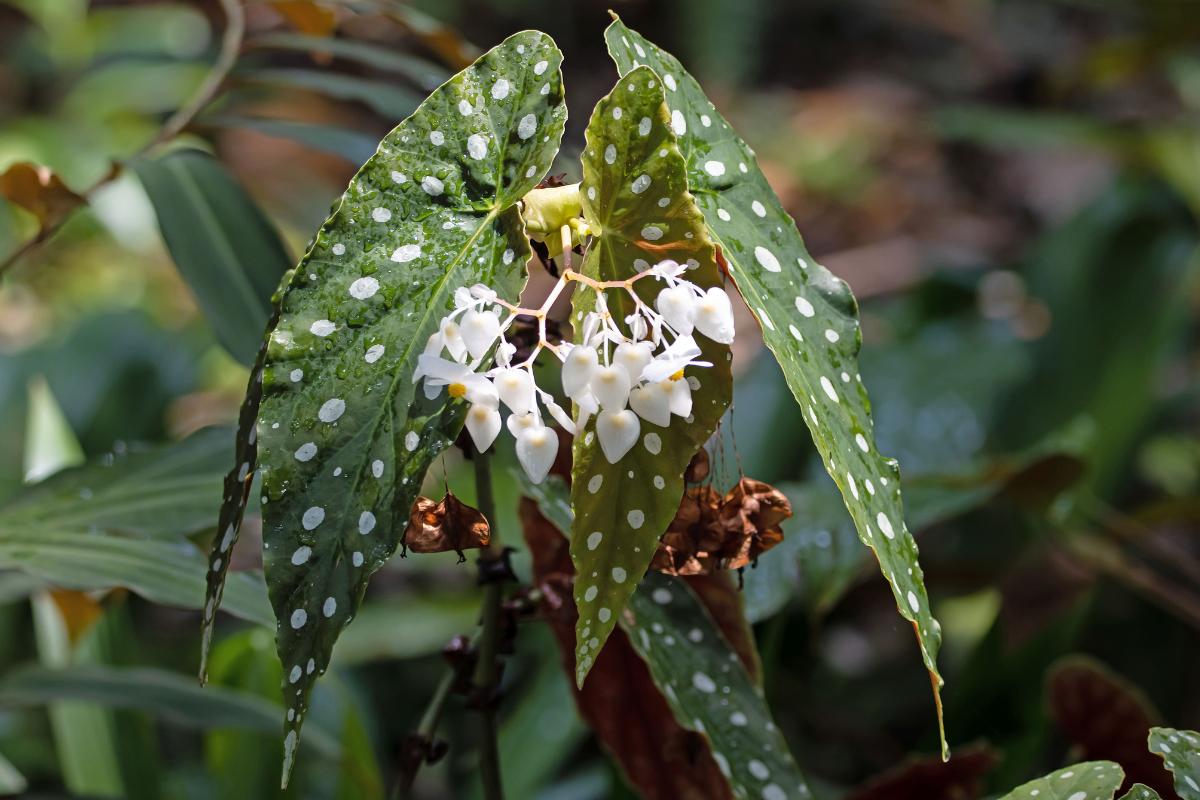 - Esta begonia destaca por sus hojas alargadas con puntos blancos plateados, que contrastan de una manera muy atractiva con el verde oscuro de las hojas, que tiende casi a negro por la ilusión óptica que genera dicho contraste.