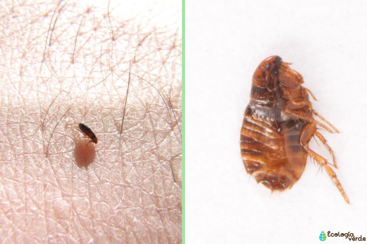Las pulgas son insectos hematófagos, es decir que se alimentan de sangre al igual que la mayoría de especies de chinches. Además, dejan picaduras en la piel similares y no tienen alas. Las pulgas miden de 2 a 3 milímetros de largo, es decir que son más pequeñas que las chinches. Además, tienen patas mucho más largas con las que se desplazan a saltos, y el cuerpo está comprimido lateralmente, no dorsoventralmente como las chinches. Las pulgas tienen probabilidad más alta de transmitir enfermedades que las chinches, y pueden transmitir peste bubónica o tifus.