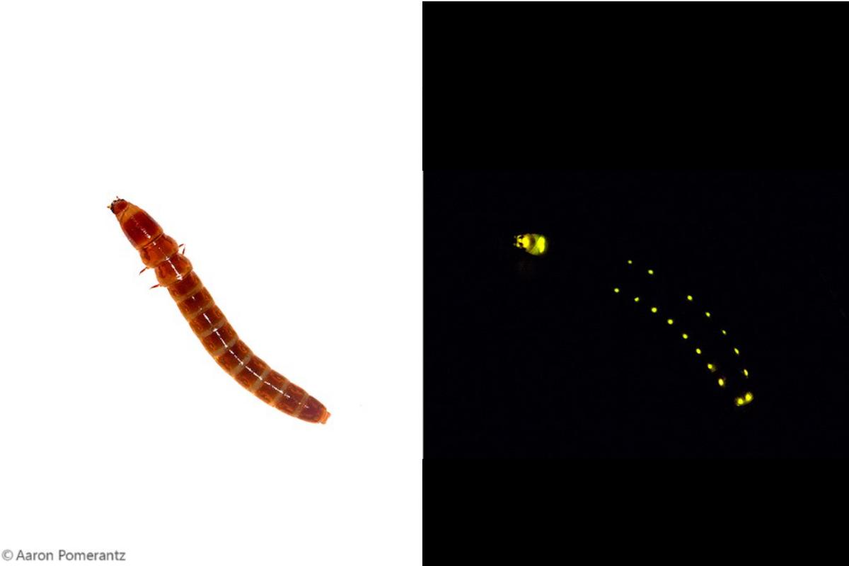 El gusano ferrocarril es la larva de un escarabajo, y sorprendentemente emite dos colores de bioluminiscencia. La cabeza brilla en rojo, un color poco común en bioluminiscencia, y el cuerpo con pequeños puntos a los extremos de cada segmento brillando en color verde. La luz roja le sirve para alumbrar su paso entre la oscuridad, y las luces verdes ahuyentan a los depredadores. Son parientes cercanos de las luciérnagas, así que es de esperarse que cuando crecen pierden la luz roja y mantienen la verde.
