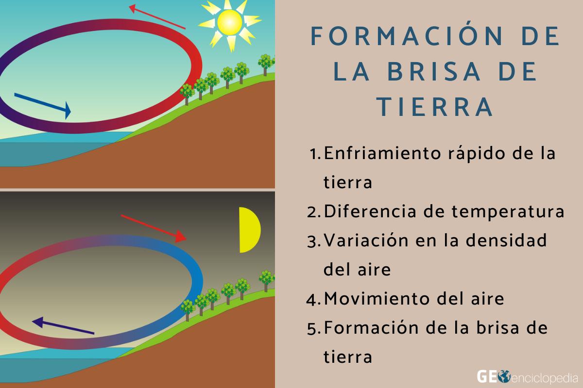 - La brisa de tierra ocurre de noche. La tierra se enfría rápidamente después de la puesta del sol, mientras que el agua conserva el calor por más tiempo. El aire sobre la superficie terrestre se enfría y se vuelve más denso, desplazándose hacia el mar para reemplazar al aire cálido que asciende allí. Este viento sopla desde el continente hacia el agua y suele ser más seco y débil que la brisa marina.