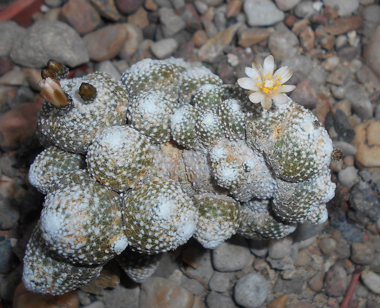 Es un cactus globoso con 8 segmentos marcados, y las areolas carecen de espinas. En su lugar tienen únicamente tricomas que parecen pelusilla. Es similar al peyote, pero la flor en este caso es blanca a amarilla. El tallo es muy liso de color verde brillante oscuro. Existe un sinfín de variedades creadas a partir de esta especie, con caracteres peculiares resaltados.