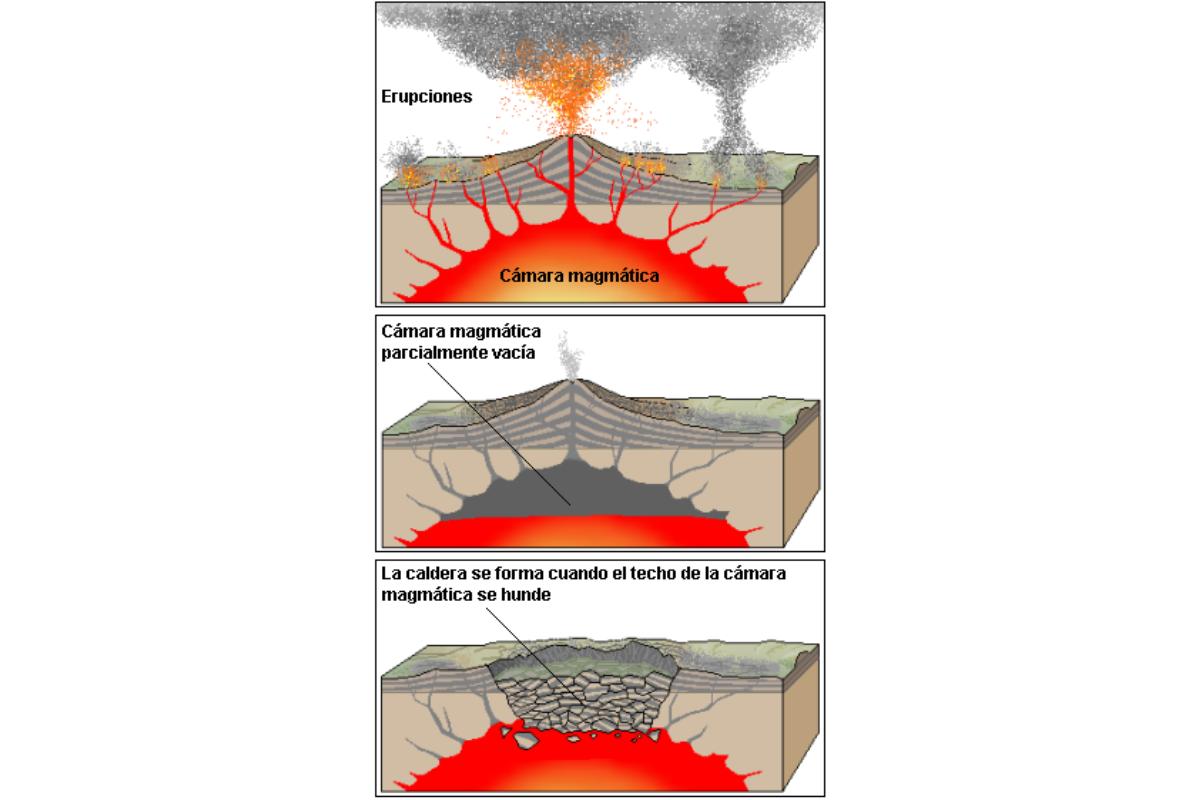 La formación de una caldera volcánica es un proceso complejo que ocurre en varias etapas: