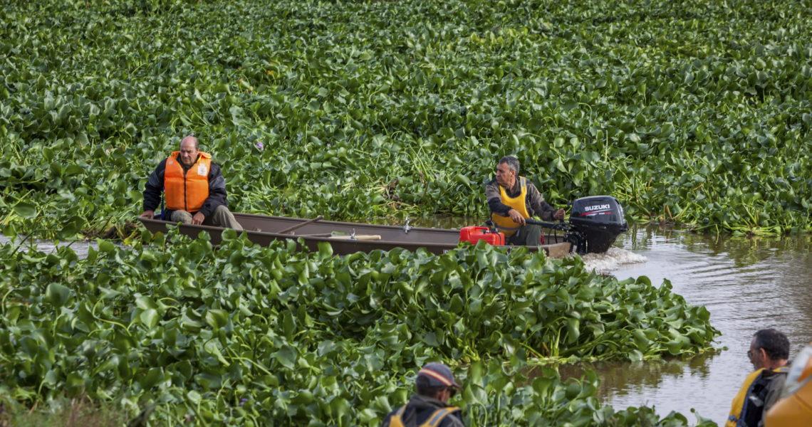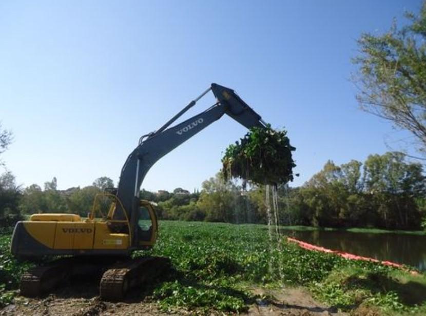 Dado que no es posible usar herbicidas en medios como el del Guadiana, la retirada del camalote debe realizarse de forma mecánica, con maquinaria industrial cuando es posible, y de forma manual cuando no queda más remedio.