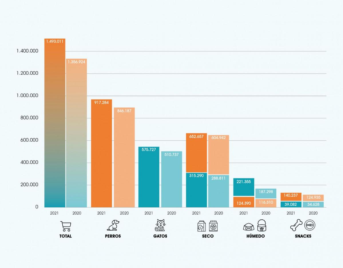 Por tipo de alimento, en seco el volumen de ventas crece un +1,2 % para perros (324.767 t) y +6,4 % para gatos (113.894 t) y, en húmedo, un +13 % para perros (53.466 t) y en gatos un +12,8 % (55.645 t). En los snacks se dan aumentos del +13,5 % (15.941 t) en perros y del +32,4 % (1.682 t) en gatos. De nuevo, destaca el impulso del canal especializado, con un crecimiento del +9,3 % y los incrementos significativos en snacks para gato (+67 %) y alimento húmedo para perro (+46,4 %).