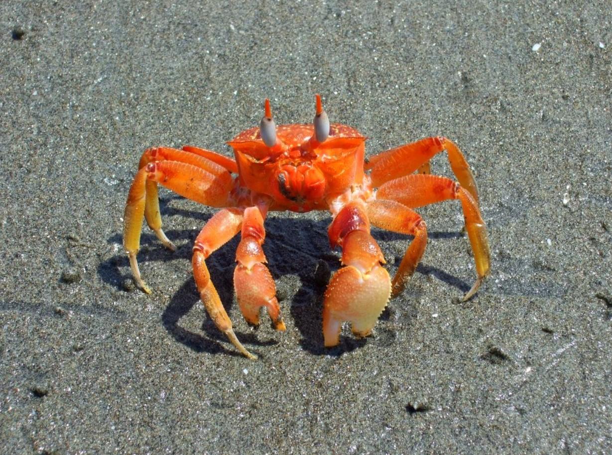 - El cangrejo fantasma rojo (Ocypode gaudichaudii)se caracteriza por ser de color rojo intenso, con puntos blanquecinos en el caparazón y de textura granulosa. A veces se pueden encontrar ejemplares naranjas en tonalidades diferentes. Se le conoce como cangrejo fantasma rojo o cangrejo playero.