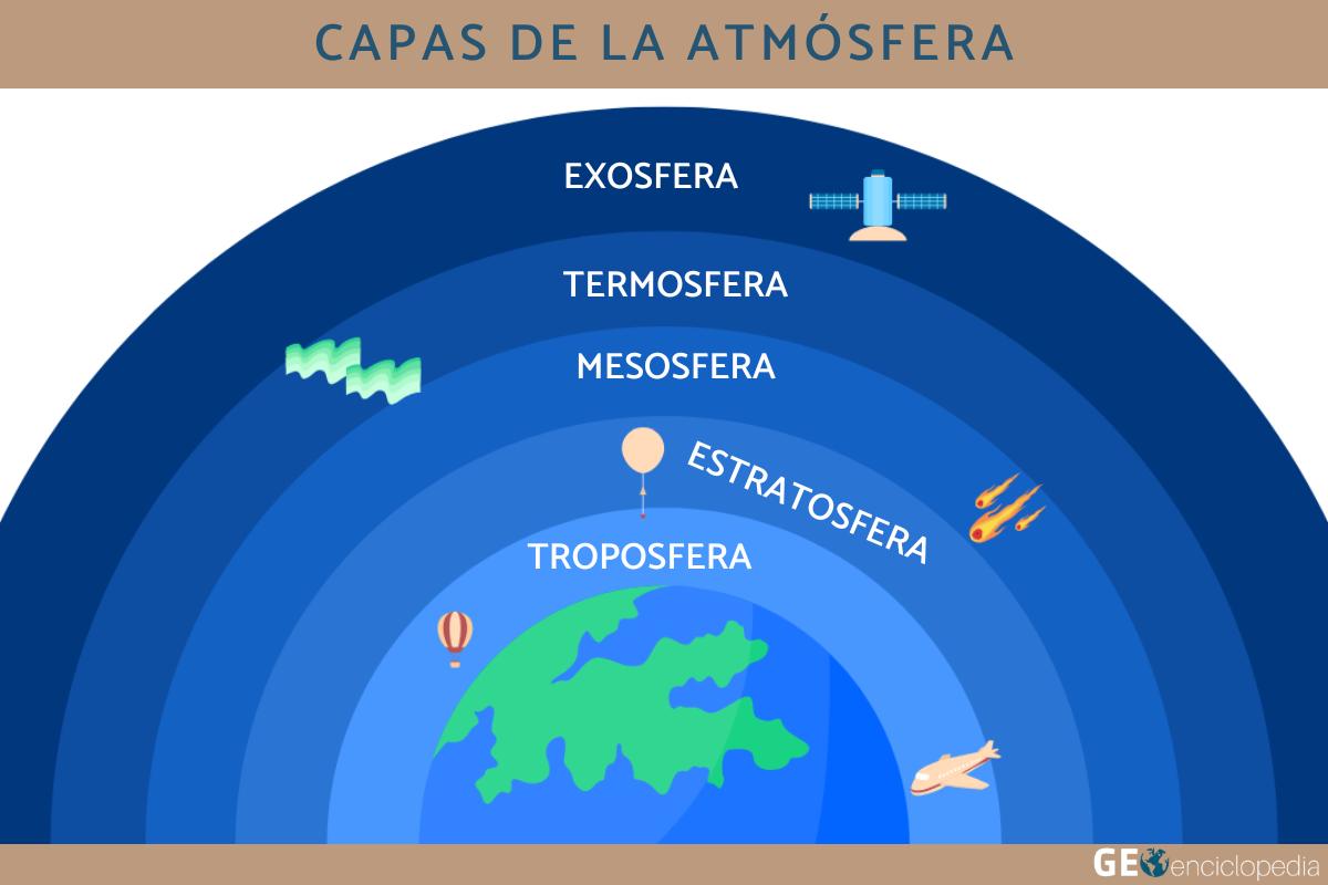 La atmósfera de la Tierra es una capa compuesta por gases que rodea a todo el planeta. Es una zona de gases muy gruesa y amplia, que consta de 5 partes o capas con distinta composición y distintas funciones. Las capas de la atmósfera son la troposfera, estratosfera, mesosfera, termosfera y exosfera. Por ejemplo, el clima que nos afecta está en la capa denominada troposfera.
