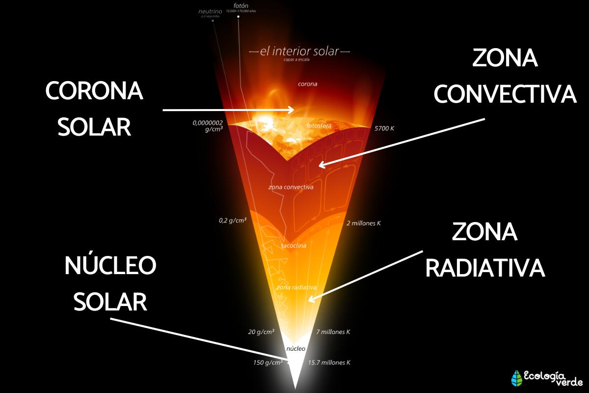 Las capas del sol son las siguientes: núcleo, zona radiativa, zona convectiva, fotosfera, cromosfera y corona. Cada una de ellas tiene una función y características. El sol es la estrella más grande y más próxima a nuestro planeta Tierra. Concretamente, se encuentra a 149,6 millones de km. Los planetas son atraídos por su gran atracción gravitacional y orbitan a su alrededor. Se clasifica como una enana amarilla de tipo G2 y no es ni muy grande ni pequeña, por lo que es un tipo de estrella bastante común en la Vía Láctea. En este artículo de EcologíaVerde vamos a enseñarte cuáles son las diferentes capas del sol, sus características y funciones.