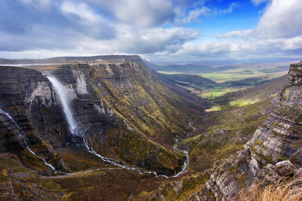 El Salto del Nervión se encuentra en el Parque Natural de Monte Santiago, entre Burgos y Álava. Es conocido por ser uno de los saltos de agua más altos de la península ibérica, con una caída aproximada de 222 metros. Es importante tener en cuenta que la altura puede variar según las condiciones de flujo de agua. La cascada se forma cuando el río Nervión se precipita desde un acantilado, creando una vista espectacular y una fina niebla, especialmente en días ventosos, que da nombre al lugar.