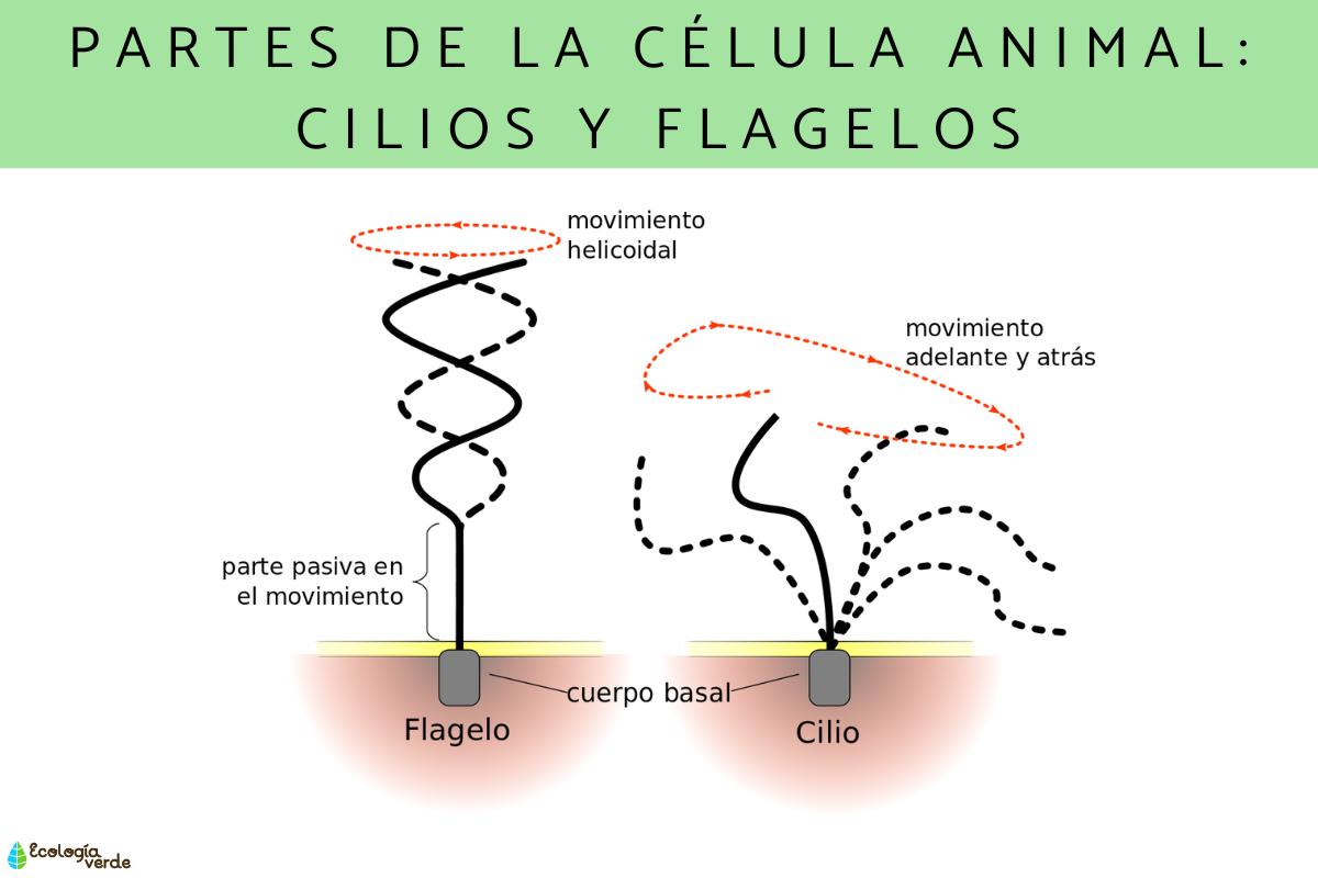 Los cilios y flagelos de la célula animal son apéndices formados por microtúbulos que dan movilidad a la célula. Están presentes en los organismos unicelulares y son los responsables de su locomoción y en otras células sirven para remover el medio o para la función sensorial. En cuanto al número, los cilios son más abundantes que los flagelos.